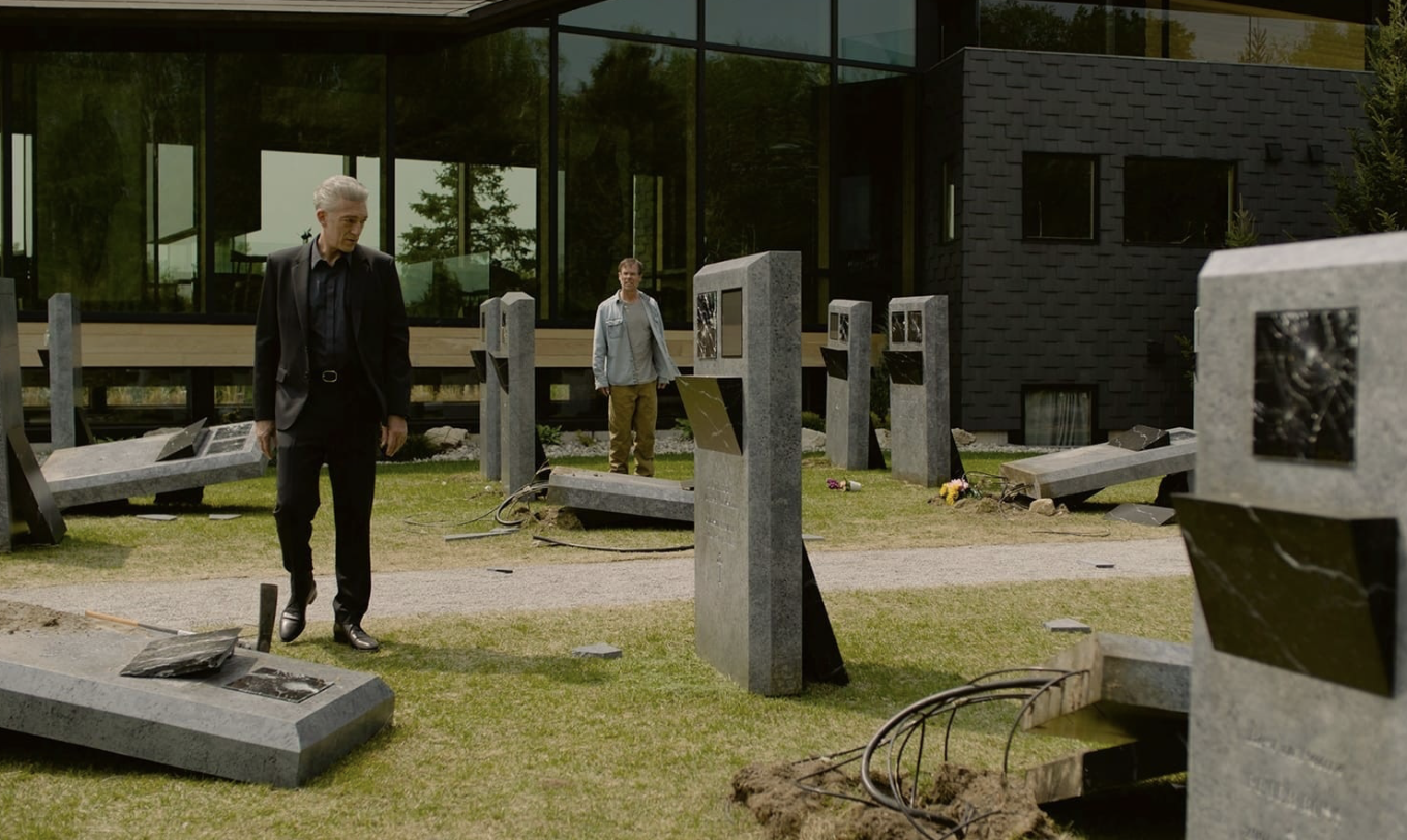 Set against a backdrop of a cold, dystopian Toronto, the film revolves around Karsh, the CEO of GraveTech. The company makes technology that allows mourners to view a live feed of their departed loved one’s decaying corpse via a screen on their gravestone, all made possible by the titular shrouds; strange garments embedded with cameras. When some of the graves (including that of his own wife Becca) are mysteriously vandalised, Karsh attempts to get to the heart of the crime with the help of Becca’s twin sister and her ex-husband Maury. Meanwhile, Karsh is also experiencing disturbing, erotic dreams where his wife appears, increasingly mutilated.