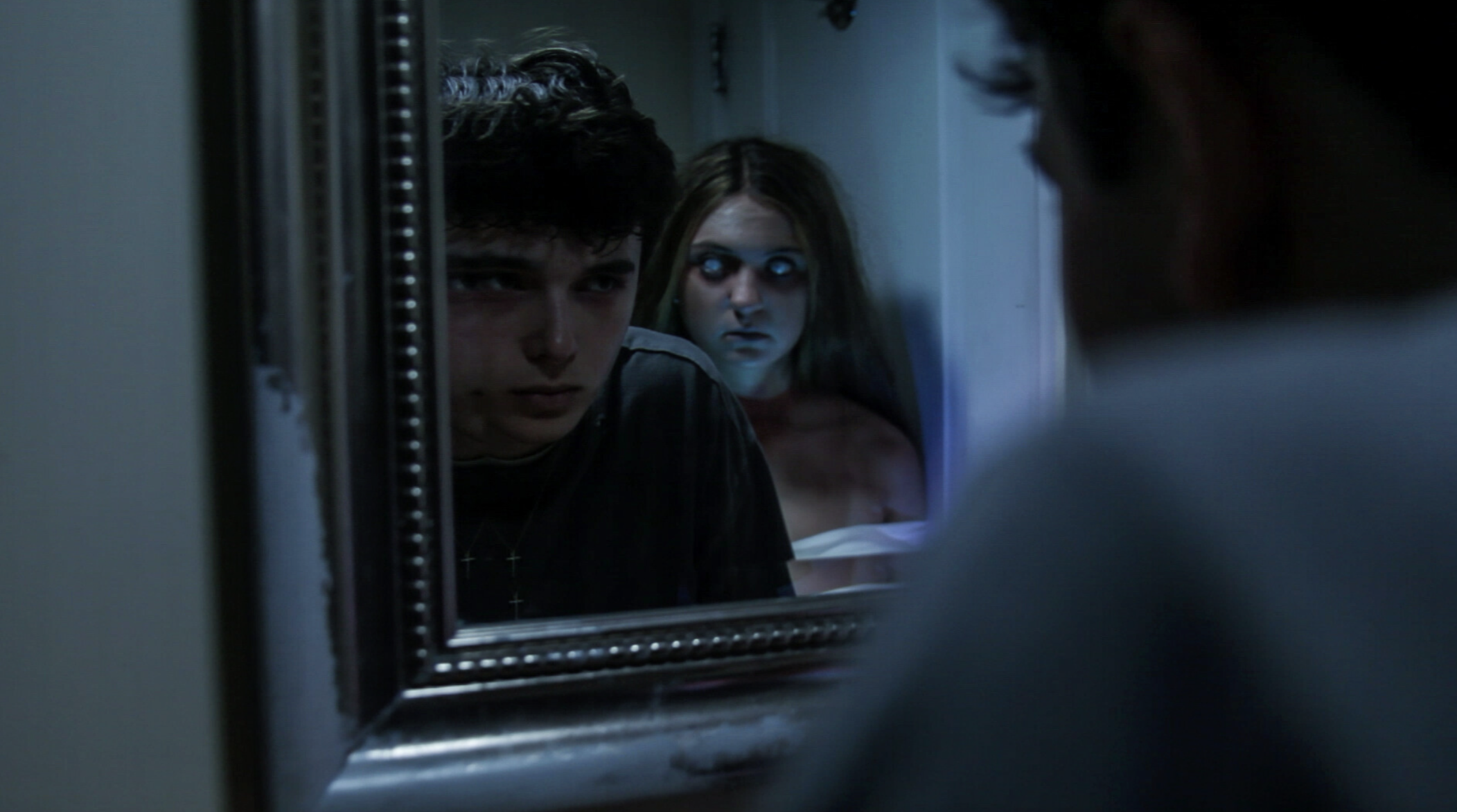 During moments of connection between the characters, Mark is plagued with imposing visions of Anna. They strike in flashes, parallel shots that are quite literally day and night, showcasing the mirrored reality Mark slips into. The imaginations are initially ethereal yet ominous as Mark feels the first spark of attraction, Anna appearing like a misshapen angel. As the film goes on, the visions become filled with malice, the demonic vision of Anna taking over as the real Anna is slowly eroded from the narrative. The excellent make-up and styling in these portions, paired with desaturation of colour and harsh lighting, greatly elevate this chilling insight into Mark’s psyche.